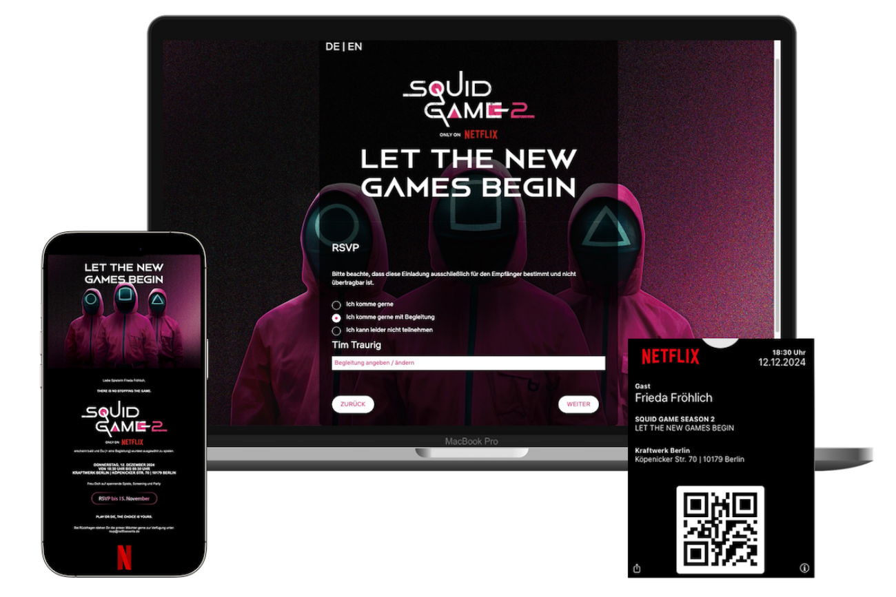 Special Screening zum Start der zweiten Staffel von Squid Game im Kraftwerk Berlin: Rund 500 geladene Gäste, darunter Influencer, Branchenpartner und treue Fans tauchen tief in die Welt von Squid Game ein. Neben einer exklusiven Preview in die neue Staffel können sich die Teilnehmer selbst bei interaktiven Spielen aus der Serie beweisen und Teil des „Squid Game“-Universums werden.
