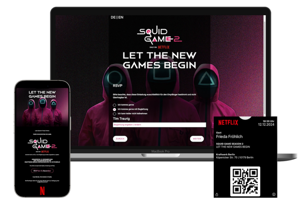 Special Screening zum Start der zweiten Staffel von Squid Game im Kraftwerk Berlin: Rund 500 geladene Gäste, darunter Influencer, Branchenpartner und treue Fans tauchen tief in die Welt von Squid Game ein. Neben einer exklusiven Preview in die neue Staffel können sich die Teilnehmer selbst bei interaktiven Spielen aus der Serie beweisen und Teil des „Squid Game“-Universums werden.